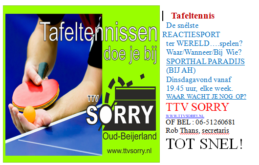 TTV Sorry Mijn naam is Rob Thans, ik ben sinds april 2024 secretaris van TTV Sorry in Oud-Beijerland en fysiotherapeut. Ik heb in 2025 met succes Ping Pong... Lees verder